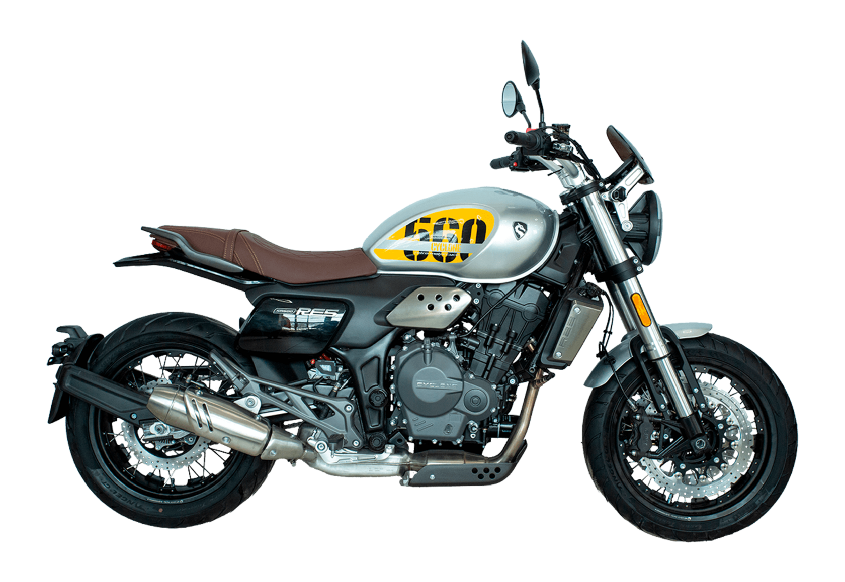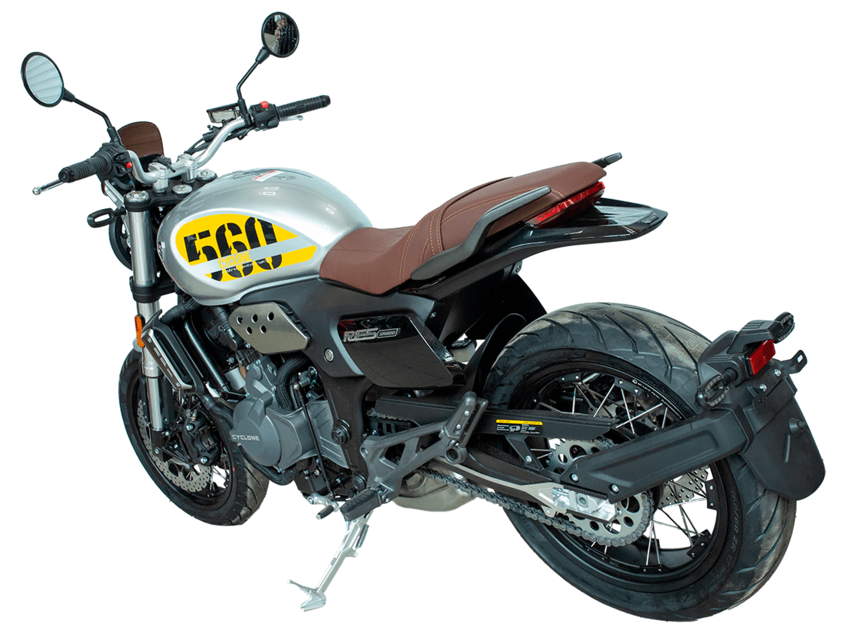 CYCLONE RE5 (SR600) – классик, в котором брутальная простота объединяется с современными технологиями. Данная модель является самой крупнокубатурной среди классических мотоциклов компании CYCLONE.Двухцилиндровый четырёхтактный двигатель объёмом 550 см3 выдаёт 60 л.с. на 8500 об/мин. Максимальный крутящий момент достигается на 6500 об/мин и составляет 55 Н·м. Инжекторный впрыск топлива с блоком управления BOSCH увеличивает топливную экономичность, а также позволяет добиться высокой приёмистости и неприхотливости агрегата. Жидкостная система охлаждения не допустит перегрева двигателя даже при самом агрессивном вождении. На мотоцикл установлена 6-ступенчатая механическая коробка передач.Максимальная скорость мотоцикла составляет 170 км/ч.RE5 оснащён классическими спицевыми колёсами диаметром 17 дюймов. Колёса обуты в бескамерные покрышки от легендарной фирмы PIRELLI. С неровностями дороги эффективно справляются телескопическая вилка перевёрнутого типа спереди и маятник с моноамортизатором сзади. Ход передней подвески составляет 120 мм, задней – 50 мм. Оба компонента подвески являются регулируемыми. Эффективное и безопасное замедление с любых скоростей обеспечивают гидравлические дисковые тормоза с ABS спереди и сзади. Тормозные системы произведены известной испанской фирмой J.JUAN (входящей в легендарный холдинг BREMBO).Клиренс мотоцикла составляет 155 мм. Объём топливного бака – 20 л. Снаряжённая масса – 204 кг.Из дополнительного оборудования можно выделить USB-порт и датчики давления в шинах.Мотоцикл сочетает в себе отличные технические характеристики, комфорт и надёжность, что позволяет вам ощутить настоящую свободу на любой дороге.