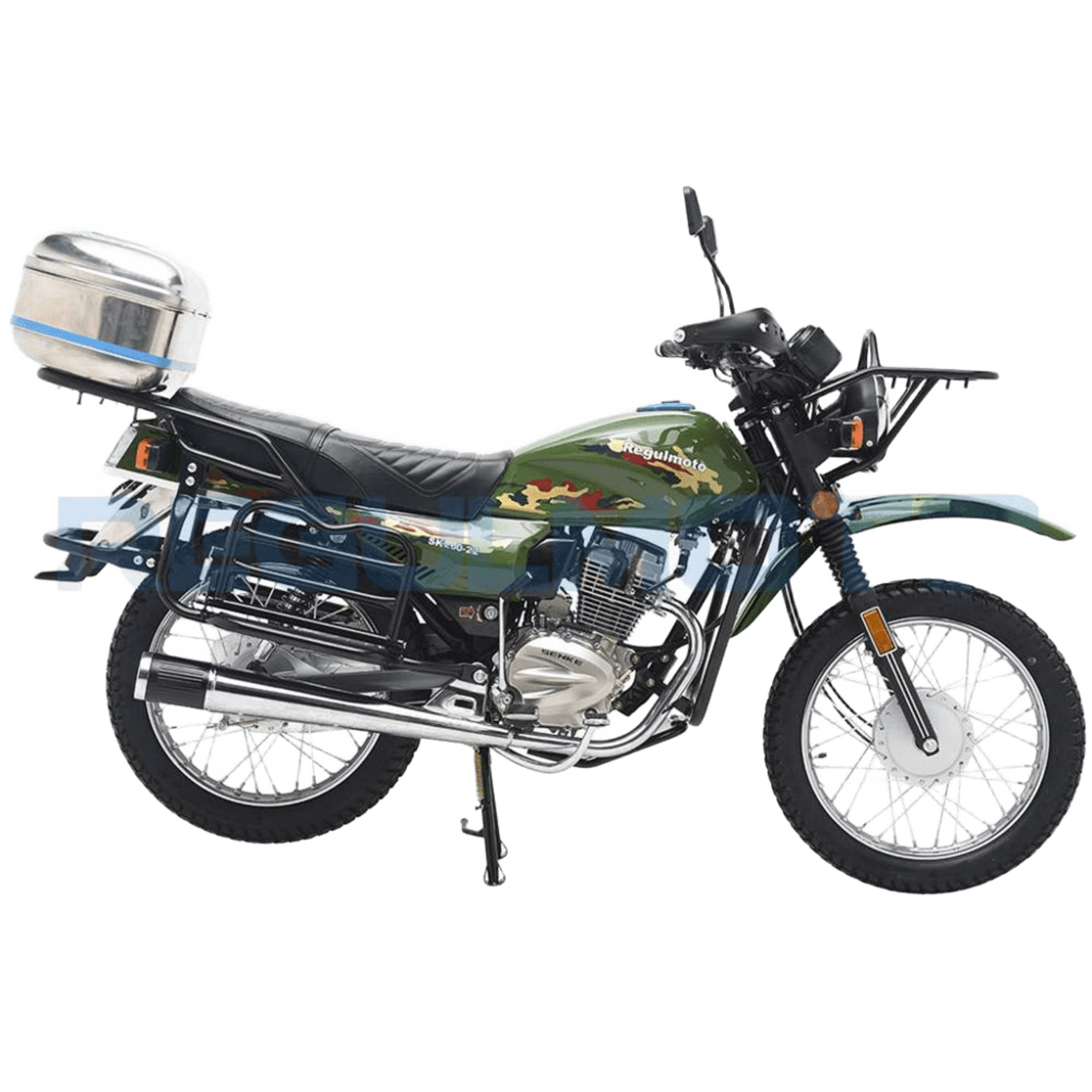 Regulmoto SK200-22 – достойный представитель класса классических дорожных мотоциклов. Эта модель может быть использована в качестве надежного и экономичного средства передвижения по дорогам общего пользования и легкому бездорожью для решения широкого круга эксплуатационных задач.Данный мотоцикл разработан специалистами известной мотоциклетной компании SENKE и собирается на ее производственных мощностях. Благодаря высоким стандартам контроля качества продукция компании пользуется заслуженным признанием экспертов мотоиндустрии и поклонников двухколесного транспорта во многих странах мира.В раме Regulmoto SK200-22 устанавливается проверенный временем 4-тактный одноцилиндровый 200-«кубовый» двигатель с 5-ступенчатой коробкой передач и электростартером, работающий в паре с карбюратором. Средний расход топлива составляет меньше трех литров на сто километров пути. Подвеска представлена телескопической вилкой спереди и двумя амортизаторами сзади. Тормозная система мотоцикла базируется на классических барабанных тормозах в ступицах 18-дюйомвых колес.Мотоцикл в стоковой комплектации оснащается дугами безопасности, кожухом защиты цепи, защитой рук, защитой двигателя, центральной и боковой подножками. Откидные площадки под боковые кофры, передний и задний багажник с установленным на нем кофром позволят перевозить массу полезного груза – заявленная производителем грузоподъемность составляет 180 кг. Благодаря значительному клиренсу, высокому расположению крыльев, комплектации кофром и багажниками мотоцикл Regulmoto SK200-22 способен стать оптимальным выбором для поездок в лес, на рыбалку или охоту.