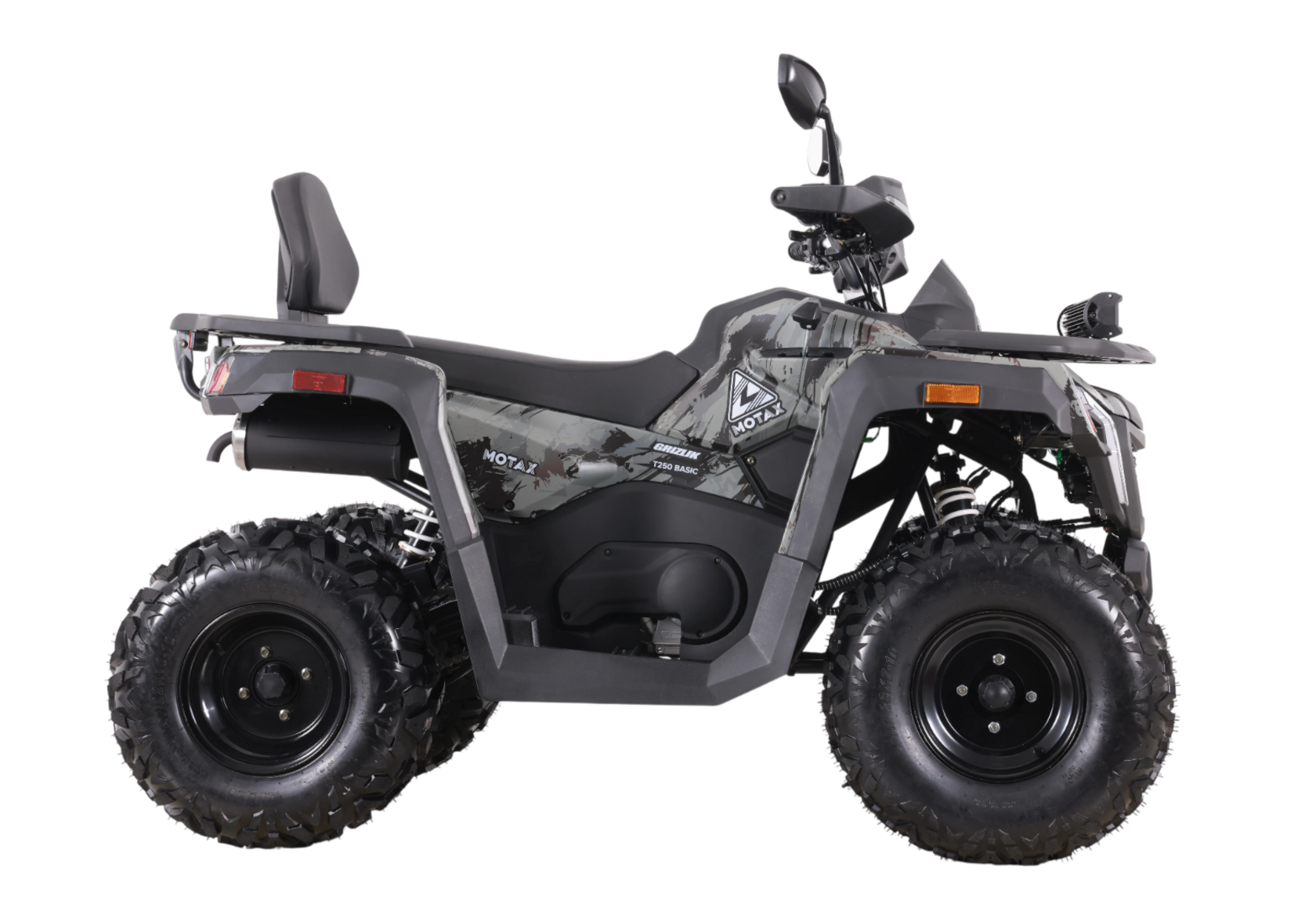 MOTAX GRIZLIK T250 BASIC предлагает множество функций для повышения безопасности и удобства эксплуатации. Защита рук и зеркала заднего вида обеспечивают дополнительную защиту для водителя, а наличие поворотников и стоп-сигналов делает квадроцикл более заметным на дороге.