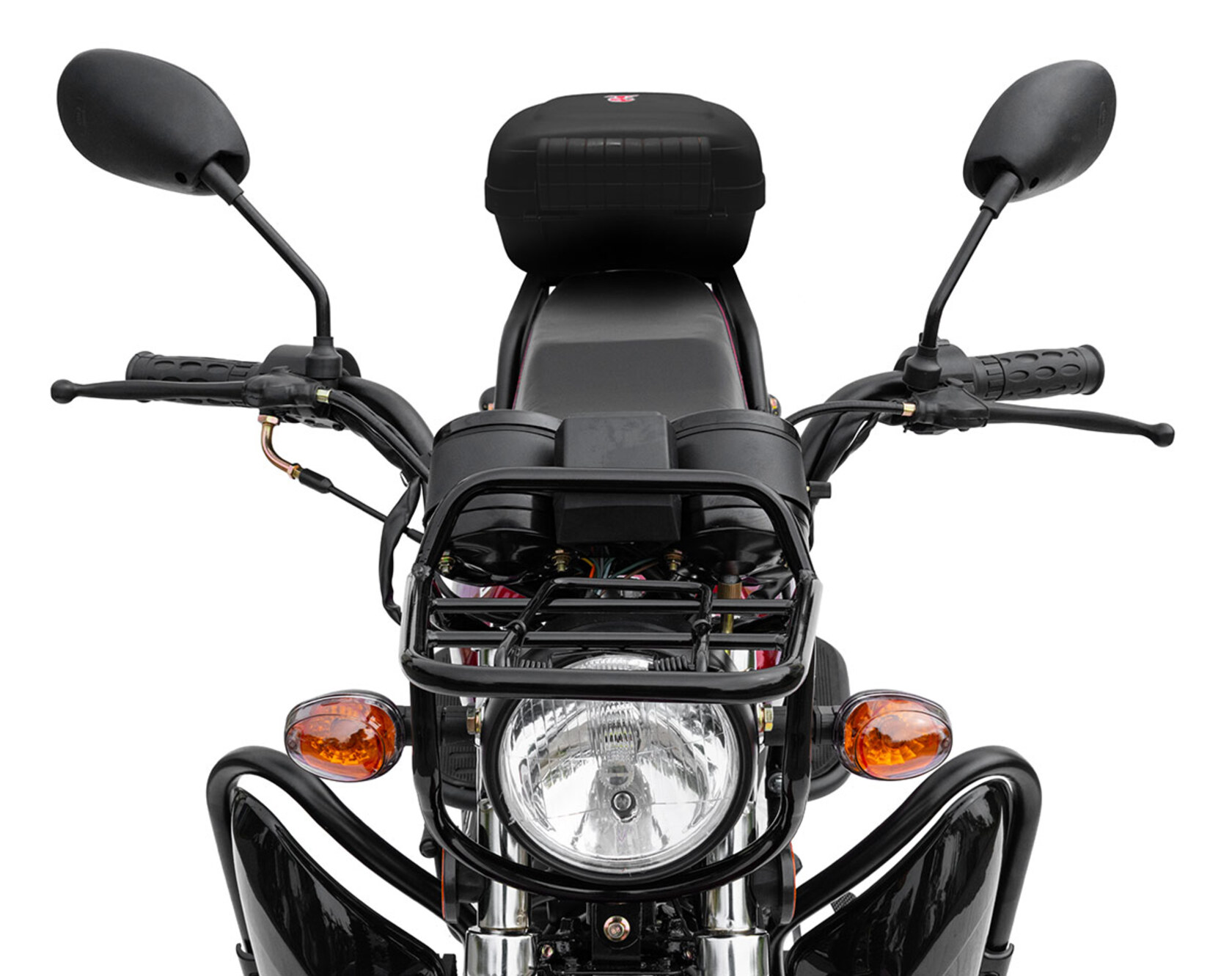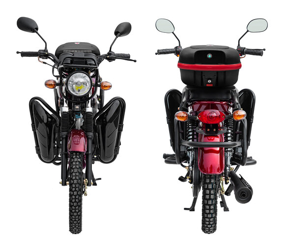 Комплектация Тормозная система – два барабанных тормоза. Усиленные тросы переднего тормоза и сцепления. Кроме того, на Regulmoto Alpha (RM-2) установлены зеркала заднего вида, подножки для пассажира, багажный кофр, пластиковые бардачки, кожух защиты цепи и дуги безопасности.