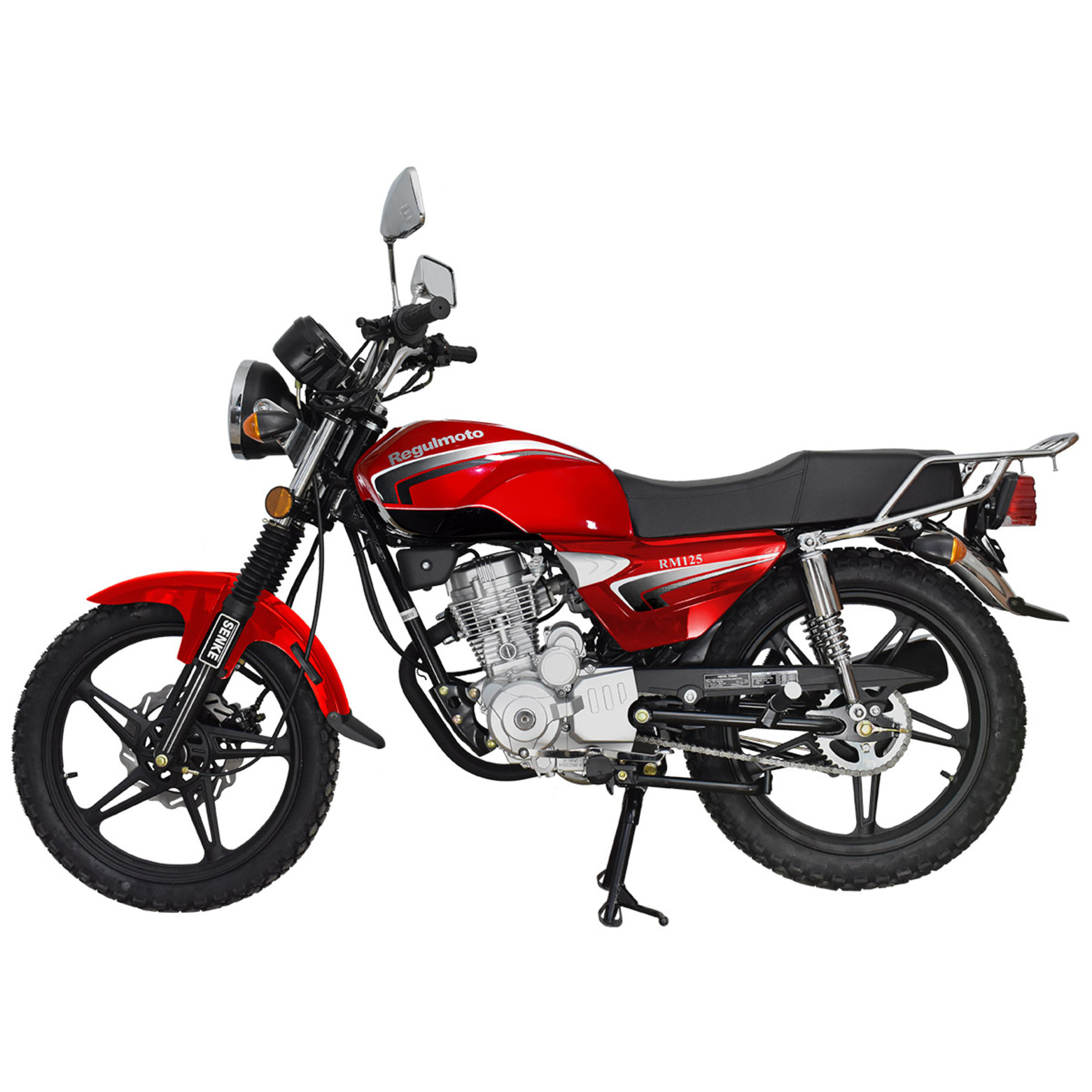 Regulmoto RM 125 – классический дорожный мотоцикл с надежным и экономичным двигателем небольшой кубатуры, который станет отличным выбором для повседневных поездок и утилитарного использования, как для начинающих, так и для опытных мотоциклистов.Мотоцикл Regulmoto RM 125 – популярная модель в ряду мототехники известного китайского производителя Senke, благодаря доступности и простоте эксплуатации заслужившая признание поклонников мототехники во всем мире. В раме байка с 18-дюймовыми колесами на легкосплавных дисках установлен одноцилиндровый 4-тактный двигатель с воздушным охлаждением рабочим объемом в 124 см3, способный развивать мощность 10,8 лошадиных сил. Подвеска мотоцикла представлена телескопической вилкой спереди и двумя амортизаторами сзади. Комфорт повседневного использования также обеспечивают электростартер, аналогово-цифровая приборная панель с замком зажигания, удобное сиденье, складные подножки пассажира, крепкий багажник, широкие крылья с брызговиками, центральная и стояночная подножка.За безопасность эксплуатации отвечают дисковый тормоз на переднем колесе и барабанный тормоз сзади. Regulmoto RM 125 оснащен полным комплектом оборудования, необходимого для передвижения по дорогам общего пользования: передние и задние поворотники, стоп-сигнал, фара головного света, на руле также установлены зеркала заднего вида. С мотоциклом Regulmoto RM 125 вы получите возможность не только оперативно решать повседневные дела – вы можете стать обладателем незаменимого помощника для утилитарных задач с доступной ценой и недорогим сервисным обслуживанием.У нас Вы можете купить этот мотоцикл с бесплатной доставкой по РФ и гарантией до года. Также его можно приобрести в рассрочку или в кредит.