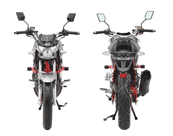 Серия мототехники SK200 базируется на одноцилиндровом 4-тактном двигателе вертикального типа, который способен выдавать почти 14 «лошадей» максимальной мощности. Наличие балансирного вала позволяет снизить вибрации мотора для большего комфорта поездок. Работа подвески мотоцикла организована на базе стандартных компонентов: передней телескопической вилки (комплектуется защитой перьев) и двух задних моноамортизаторов.