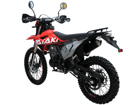 Кроссовый мотоцикл ATAKI S004 300 (4T PR300) – отличный снаряд для внедорожного экстрима, представляющий собой оптимальный баланс производительности и технической оснащённости, поэтому он идеально подходит как новичкам, так и опытным райдерам. Удобный, простой и надёжный мотоцикл, который полностью оправдывает свою цену.Мотоцикл оснащён одноцилиндровым 4-тактным двигателем воздушного охлаждения (ZONGSHEN PR300/ZS175FMM-5) объёмом 271 см3, который обеспечивает мощность в 24 л.с., что позволяет развивать большую скорость и с лёгкостью преодолевать трассы со сложным рельефом. Карбюратор NIBBI PE30 обеспечивает бесперебойную работу техники в самых жёстких условиях эксплуатации, простоту и лёгкость в обслуживании, а также неприхотливость к качеству топлива. Двигатель работает в паре с 5-ступенчатой механической коробкой передач с классической схемой “1-N-2-3-4-5”. Передняя подвеска — телескопическая вилка перевёрнутого типа длиной 830 мм, регулируемая на отбой, задняя — регулируемый моноамортизатор 450 мм. Мотоцикл оснащён классическими спицованными колёсами диаметром 18 и 21 дюйм. Эффективное и безопасное замедление с любых скоростей обеспечивают гидравлические дисковые тормоза.Высококачественная износостойкая резина с развитым протектором отлично держит дорогу на различных типах покрытия и в самых разных поворотах. Благодаря удобным подножкам и сиденью эргономичной формы, покрытому антискользящим материалом, на мотоцикле комфортно ездить вдвоём. Модель оснащена защитой кистей рук, задним багажником-решёткой и эргономичными зеркалами заднего вида. Объём топливного бака составляет 10 л, чего с успехом хватает для длительных сессий. Наличие яркой светодиодной фары позволяет кататься в тёмное время суток.Мотоцикл имеет ПТС и весь необходимый комплект светотехники, позволяющий ездить по дорогам общего пользования.ATAKI S004 300 (4T PR300) сочетает в себе отличные технические характеристики, комфорт и надёжность, что позволяет вам ощутить настоящую свободу на любой трассе.