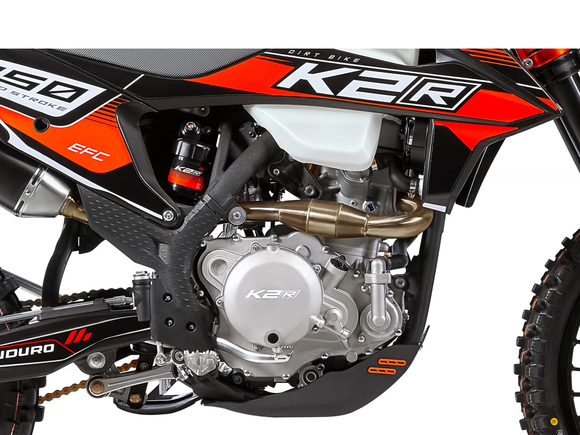 K2R 450 EFС оснащается 4-тактным одноцилиндровым двигателем жидкостного охлаждения Zongshen ZS 194MQ - одним из самых мощных моторов в линейке Zongshen.В базовое оснащение модели K2R 450 EFС входит все необходимое для спортивной езды: защита рук, защита картера двигателя, защита прогрессии задней подвески, неломающиеся ручки тормоза и сцепления, power bomb на выпуске,датчик моточасов и светодиодная фара головного освещения.Высота мотоцикла по седлу составляет 960 мм.