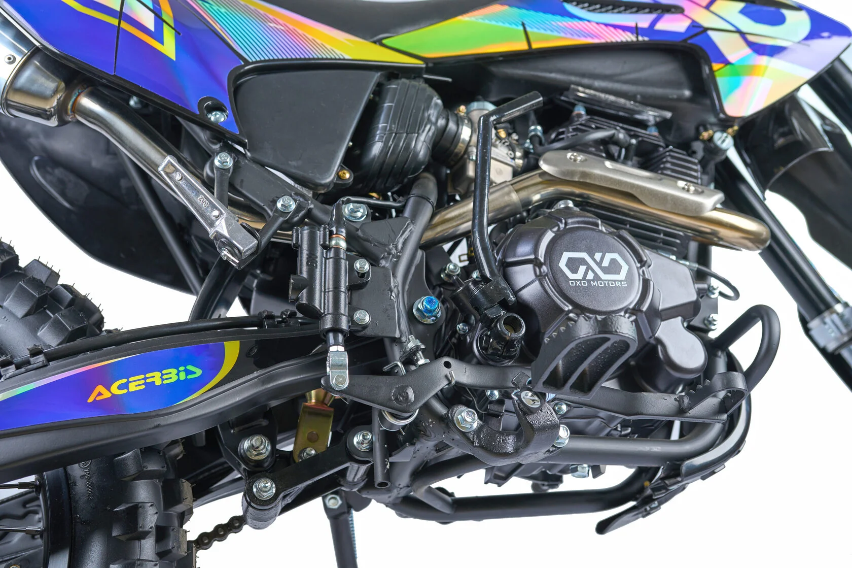 ДвигательДвигатель ZS175FMN 271 куб см с воздушным охлаждением выдаёт максимум мощности. Характеризуется хорошей тягой с самых низов и лёгким пуском с помощью электростартера. Повышенная износостойкость и качественные детали изделия позволяют применять к нему самые жёсткие требованияРамаРама мотоцикла OXO производится из труб шестигранного сечения хром-молибденовой стали, которая является очень прочной и легкой. Геометрия рамы, благодаря правильно выверенному центру тяжести и углу наклона вилки - способствует наилучшей управляемости устойчивости мотоцикла на низкой скорости.ПодвескаПередняя вилка перевернутого типа. Мотоцикл LITE 300 снабжен моноамортизатором, который соединен посредством системы рычагов прогрессии. Система прогрессии, обеспечивает равномерную, мягкую работу и увеличивает длину рабочего хода подвески.КолесаВ переднем и заднем колесах установлены антибуксаторы, которые притягивают покрышку к ободу, позволяя ездить по бездорожью при низком давлении в камерах, не давая покрышке проворачиваться во время езды.Размер передней покрышки: 80/100-21. Размер задней покрышки: 120/100-18. Они прекрасно себя ведут по песку и грязи, что позволяет райдеру отлично показать себя на пересеченной местности.Тормозная системаТормозная система мотоцикла - полностью гидравлическая с армированными шлангами. Спереди установлены двухпоршневой суппорт. Задняя тормозная система представлена в виде однопоршневого суппорта. Данная конфигурация тормозных механизмов, позволит быстро и безопасно остановиться с максимальной скорости даже на бездорожье.РульВажная часть современного эндуро мотоцикла - усиленный руль переменного сечения. Алюминиевая ручка газа с коротким ходом имеет регулировку троса. Также мотоцикл укомплектован электронной панелью приборов..