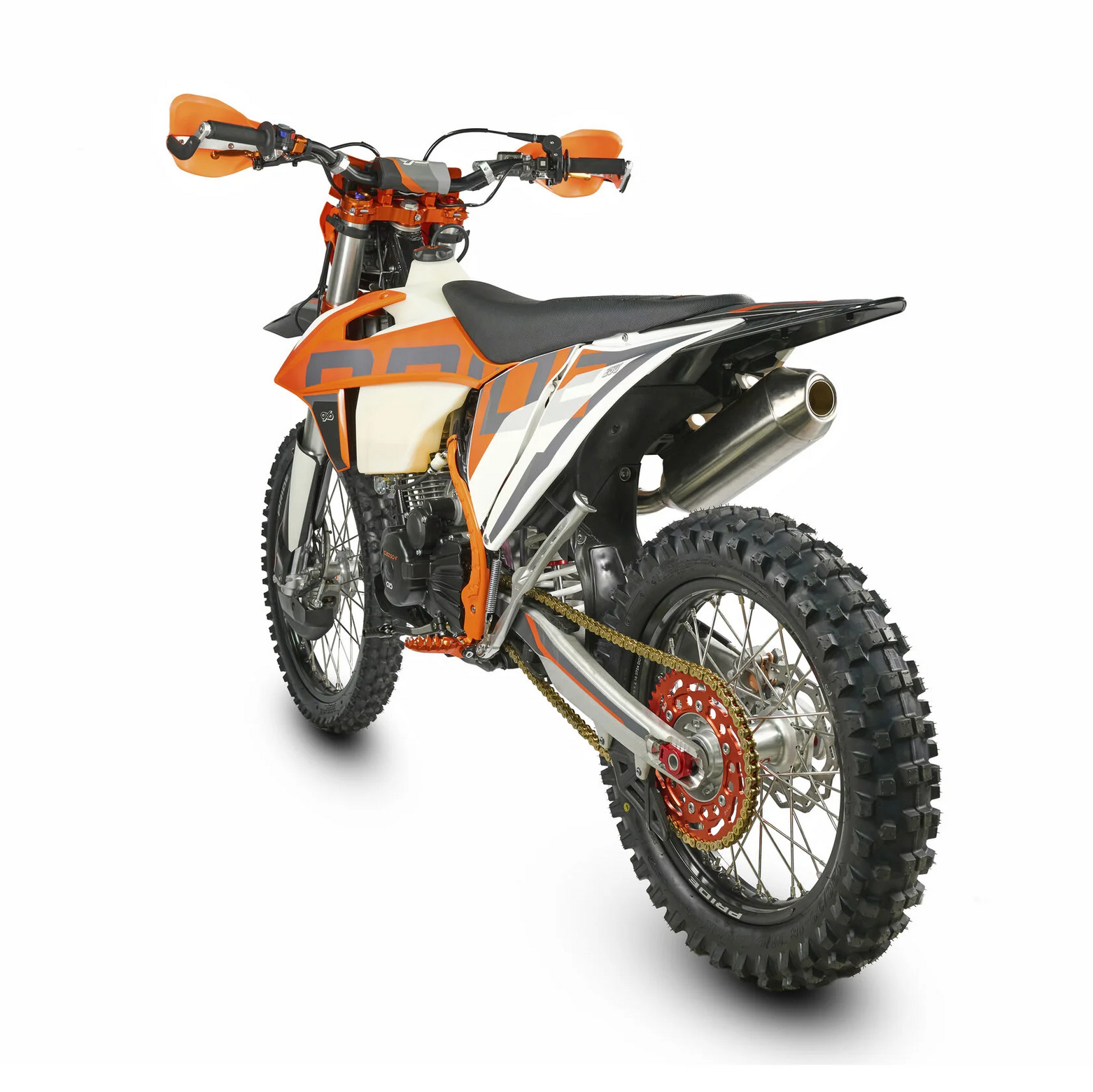 КомплектацияЭлектронная приборная панель, противоскользящее сиденье, защита рамы от протирания ботинками, подножки «AJ1» (алюминий 6063 с шипами), подножка боковая «AJ1» (алюминий 7075-Т6), невозгораемый воздушный фильтр «AJ1» – Twin Air с увеличенной площадью, ведомая звезда «AJ1» (520, алюминий 7075-Т6), защита рук, грипсы OTOM/Lock-On, передние и задние буксаторы «AJ1», откидные алюминиевые рычаги 270, алюминиевая лапка КПП, пульт света КТМ, LED фара 5 линз, моточасы, фрезерованная траверса X trig .ДвигательМодель оснащена надежнейшим 1-цилиндровым 4-х тактным двигателем ZONGSHEN 172FMM-3A с воздушным охлаждением объёмом 249,9 см3, который выдаёт 21 л.с.ПодвескаПередняя вилка "MNT" перевернутого типа T7 48- 910mm с регулировкой на сжатия и отбой. Моноамортизатор "MNT" также с регулировками. Система прогрессии, обеспечивает равномерную, мягкую работу и увеличивает длину рабочего хода подвески. Также ось крепления маятника совпадает с осью крепления ножки. Это существенно улучшает развесовку мотоцикла.КолесаСпереди и сзади установлены антибуксаторы бренда "AJ1", которые притягивают покрышку к ободу, позволяя ездить по бездорожью при низком давлении в камерах, не давая покрышке проворачиваться во время езды. Размер передней покрышки: 80/100 R21. Размер задней покрышки: 120/90-R18. Модель комплектуется "жирной" резиной "KENDA". Все эти характеристики позволяют мотоциклу отлично себя чувствовать в песке и грязи.Тормозная системаПолностью гидравлическая с армированными шлангами. Спереди и сзади установлен двухпоршневой суппорт. Данная конфигурация тормозных механизмов, позволяет быстро и безопасно оттормаживаться даже в самых непростых условиях.Сухой вес мотоцикла 115кг