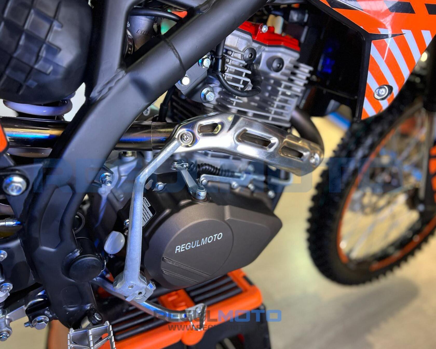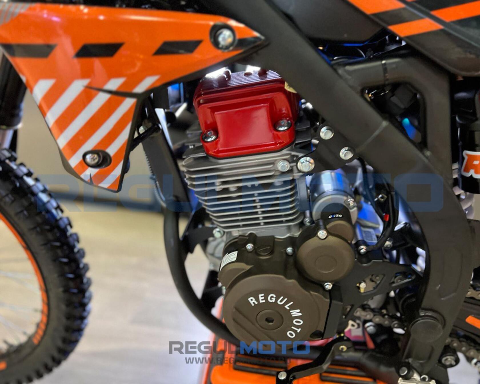 Regulmoto ZR PR Enduro 2024г. 4 клапана на цилиндр с балансирным валом«Regulmoto» представляет вниманию поклонников фри-райда мотоцикл Regulmoto ZR 4 valves. Стильный и доступный байк многоцелевого назначения найдет применение в качестве надежного аппарата для покорения бездорожья, а также может использоваться для решения широкого круга утилитарных задач и передвижения по дорогам общего пользования.В основе конструкции Regulmoto ZR 4 valves – мощная стальная рама, поставленная на колеса 21/18, которые наилучшим образом подготовлены к офф-роаду. Ободья и ступицы колес изготовлены из алюминия, также установлены усиленные спицы и буксаторы, надежно фиксирующие покрышки на ободе. Подвеску эндуро-байка представляют длинноходная телескопическая вилка-«перевертыш» спереди и стальной маятник с прогрессией и моноамортизатор с компенсационным резервуаром сзади. Работу амортизаторов при необходимости можно настроить при помощи регулировки сжатия/отбоя.Силовая установка мотоцикла представлена одноцилиндровым 4-тактным двигателем Zongshen ZS175FMM-7 с воздушным охлаждением рабочим объемом __ см3 с балансировочным валом 4-мя клапанами; за подготовку топливной смеси отвечает карбюратор Nibbi PE30. Технический потенциал надежного и производительного двигателя позволяет демонстрировать __лошадиную силу максимальной мощности и максимального крутящего момента.Regulmoto ZR PR 4 valves также привлекает внимание отличными внешними данными: мотоцикл комплектуется крепким и гибким пластиком с ярким дизайном, выполненным в узнаваемой стилистике популярной модели известного производителя. Подбор качественных компонентов также заслуживает внимания:• электронная приборная панель;