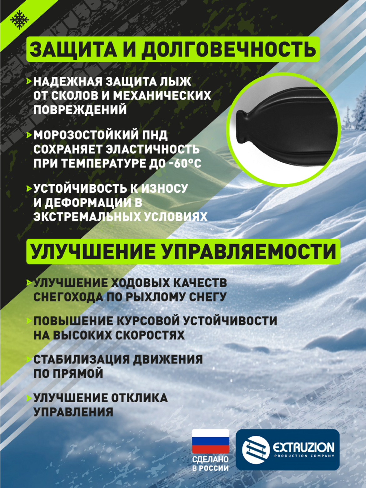 Надежная защита и долговечность. Защищает оригинальные лыжи от сколов, царапин и абразивного износа Изготовлена из морозостойкого ПНД, сохраняющего гибкость при температуре до -60C Принимает на себя основную нагрузку, значительно продлевая срок службы штатных лыж