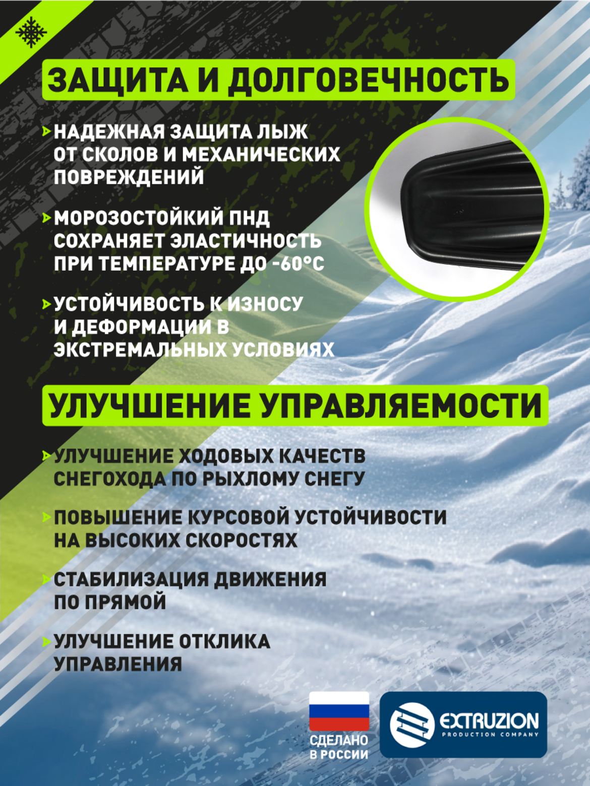 Надежная защита и долговечность. Защищает оригинальные лыжи от сколов, царапин и абразивного износа Изготовлена из морозостойкого ПНД, сохраняющего гибкость при температуре до -60C Принимает на себя основную нагрузку, значительно продлевая срок службы штатных лыж