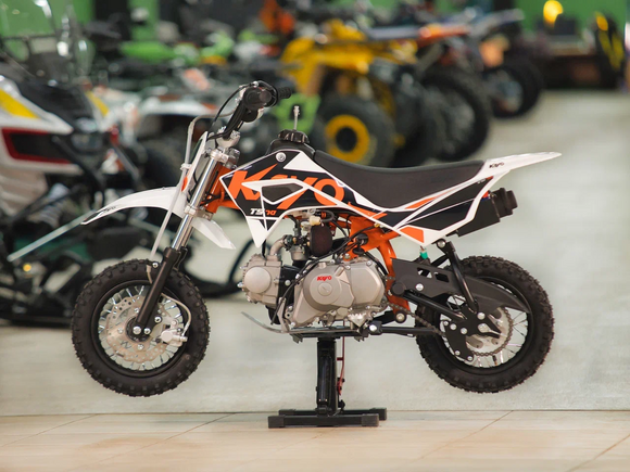 Питбайк KAYO KT50L 2T 12/10 2024 года – идеальный снаряд для юных экстремалов, который можно использовать на лёгких кроссовых трассах и дорогах с различным покрытием. Отлично подходит для тренировок юных кроссменов в классе “50сс”. Удобный, простой и надёжный мотоцикл, который полностью оправдывает свою цену.Одноцилиндровый 2-тактный двигатель воздушного охлаждения объёмом 50 см3, выдаёт очень неплохую мощность в 8,9 л.с. Карбюратор PZ обеспечивает бесперебойную работу техники в самых жёстких условиях эксплуатации, простоту и лёгкость в обслуживании, а также неприхотливость к качеству топлива. KT50L оснащён автоматической коробкой передач, что позволит райдерам полностью сосредоточиться на управлении питбайком.Мотоцикл имеет вес всего 48 кг. Усиленная рама из хром-молибденового сплава и подвеска позволяют эффективно амортизировать удары при езде по неровностям и препятствиям на трассе. Передняя подвеска – телескопическая вилка перевёрнутого типа длиной 625 мм, задняя – моноамортизатор 275 мм. Рама и пластик являются собственной разработкой производителя. Мотоцикл оснащён классическими стальными спицованными колёсами диаметром 10 и 12 дюймов. Эффективное и безопасное замедление с любых скоростей обеспечивают гидравлические дисковые тормоза спереди и сзади. Высококачественная износостойкая резина с развитым протектором отлично держит дорогу на различных типах покрытия. Байк оснащён системой запуска двигателя как кикстартером, так и при помощи кнопки электростартёра.Объём бака данной модели составляет 3,5 литра, чего при такой небольшой кубатуре хватает на достаточно продолжительную гоночную сессию.Если вы ищете послушный, компактный, динамичный и красивый питбайк для своего малыша, считайте, что вы его нашли.