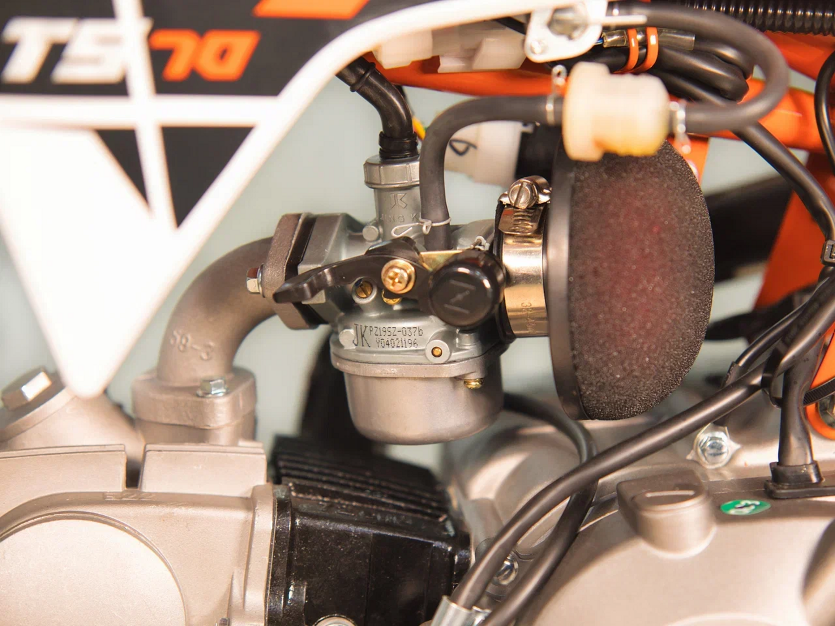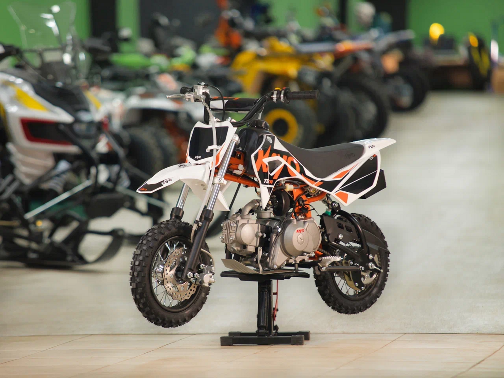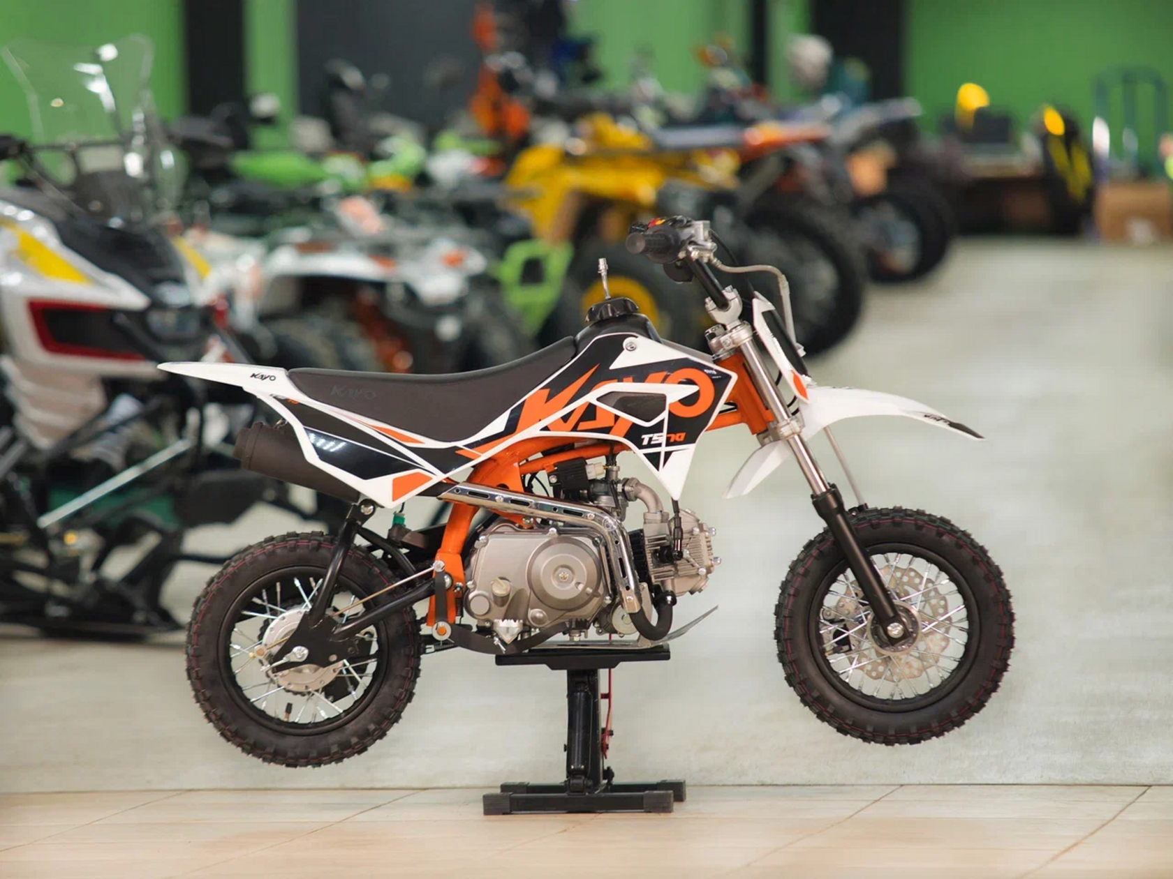 Питбайк KAYO Mini TS70 10/10 – идеальный снаряд для юных экстремалов, который можно использовать на лёгких кроссовых трассах и дорогах с различным покрытием. Удобный, простой и надёжный мотоцикл, который полностью оправдывает свою цену.Одноцилиндровый 4-тактный двигатель воздушного охлаждения YX1P47FMD объёмом 72 см3, выдаёт 5 л.с. Карбюратор JK PZ19 обеспечивает бесперебойную работу техники в самых жёстких условиях эксплуатации, простоту и лёгкость в обслуживании, а также неприхотливость к качеству топлива. Питбайк оснащён автоматической коробкой передач, что позволит райдерам полностью сосредоточиться на управлении питбайком.Аппарат имеет вес всего 52 кг. Усиленная рама из хром-молибденового сплава и подвеска позволяют эффективно амортизировать удары при езде по неровностям и препятствиям на трассе. Передняя подвеска – телескопическая вилка длиной 540 мм, задняя – моноамортизатор 255 мм. Рама и пластик являются собственной разработкой производителя. Мотоцикл оснащён классическими стальными спицованными колёсами диаметром 10 дюймов. Эффективное и безопасное замедление с любых скоростей обеспечивают гидравлический дисковый тормоз спереди и барабанный – сзади. Высококачественная износостойкая резина с развитым протектором отлично держит дорогу на различных типах покрытия. Байк оснащён системой запуска двигателя при помощи кнопки электростартера.Если вы ищете послушный, компактный, шустрый, красивый питбайк для своего малыша, считайте, что вы его нашли.