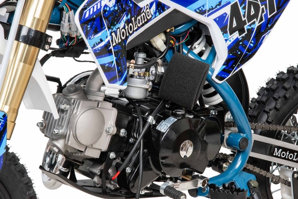Питбайк Motoland TCX125 14/12 идеален для поездок по грунтовым дорогам и бездорожью. Хорошо чувствует себя на мягком и среднем грунте, разгоняется до 90 км/ч. Оснащён спортивными траверсами, весит всего 70 кг.Питбайк прост в управлении и не требует специального ухода, подойдёт как новичкам, так и любителям мотокросса.Питбайка отличный узнаваемый дизайн. Конструкция подчёркивает неуступчивый спортивный характер, который не остановится ни перед одним препятствием.Комбинированный прочный пластик не ломается при сгибании.Передняя подвеска — телескопическая вилка перевёрнутого типа (с регулировкой по давлению воздуха), которая отлично подходит для преодоления ям, и других неровностей плохих дорог или их отсутствия. Задняя подвеска маятниковая с моноамортизатором.Мотоцикл оснащён одноцилиндровым четырёхтактным двигателем с воздушным охлаждением. Надёжный мотор 152FMI мощностью 8 л. с. и объемом 125 см³ , установленный на усиленной стальной раме, коробка передач автоматическая, четырёхступенчатая