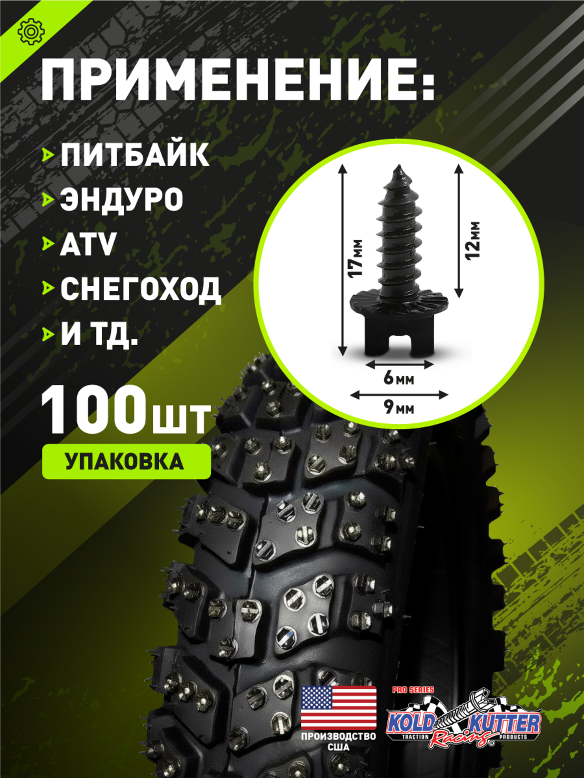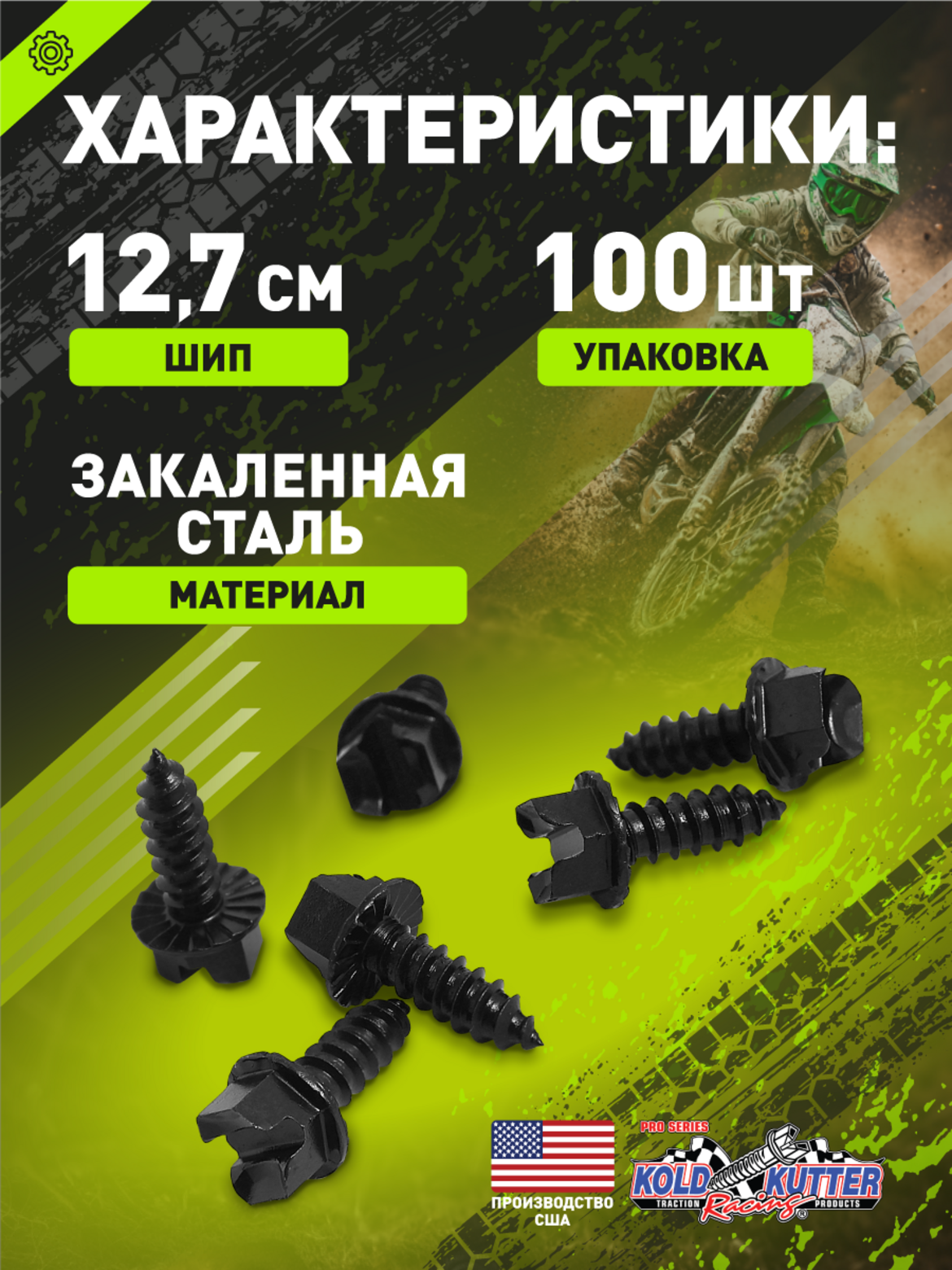 • Вкручивающиеся шипы KOLD KUTTER для мотоциклов, квадроциклов (ATV) и снегоходов. Средний размер шипа 1/2 дюйма (12 мм) с резьбой M8. Упаковка содержит 100 штук. Обеспечивают кардинальное улучшение сцепления на льду, укатанном снегу и мокрых обледенелых дорогах. Незаменимы для ошиповки как пневматических шин, так и резиновых гусениц снегоходов и мотобуксировщиков.