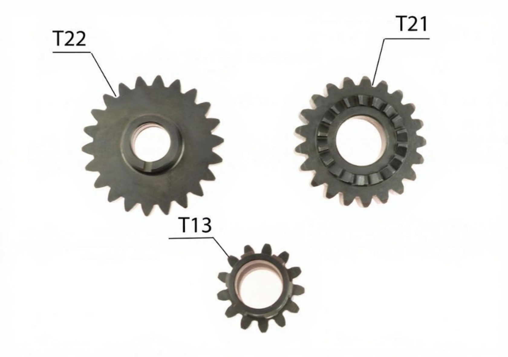 • Комплект из трёх шестерён для ремонта наиболее нагруженных и подверженных износу элементов привода двигателя. Предназначен для замены первичной и вторичной шестерни коленвала, а также шестерни кикстартера.